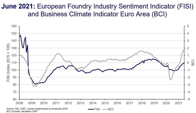 The FISI – European Foundry Industry Sentiment Indicator – is the earliest available composite indicator providing information on the European foundry industry performance. It is published by the European Foundry Association (CAEF) every month and is based on survey responses of the European foundry industry. The CAEF members are asked to give their assessment of the current business situation in the foundry sector and their expectations for the next six months.