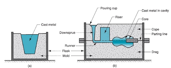 the mould-making step, a sand mould is formed by packing sand into the mould around the pattern. The sand mould is divided into two halves, the top half is called the “Cope”, and the bottom part is called the “Drag”. When the pattern has removed the cavity, it forms remains for pouring the molten metal. Mould will have other features such as Sprue, runners, gate, pouring cup, riser etc, which is discussed in detail later.