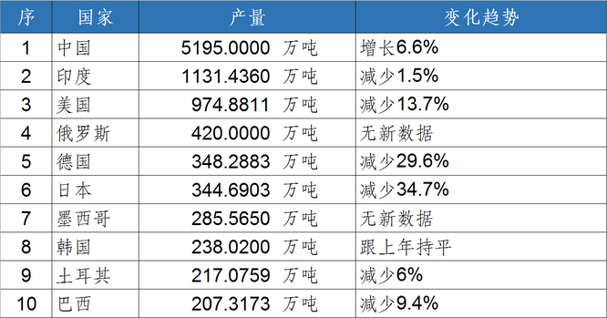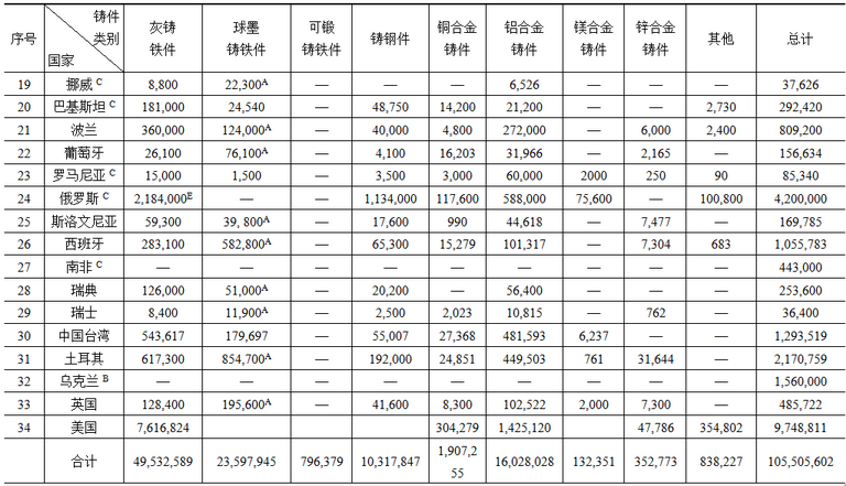 表1:2020年各国或地区铸件产量及全球产量统计表(单位:t)