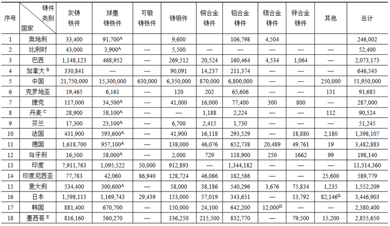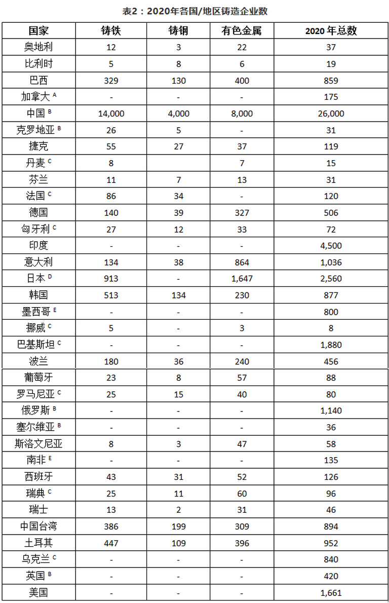 注:A)包含可锻铸铁B)2015年数据 C)2019年数据 D)包含镁合金E)2017年数据 G)包含铝合金压铸件