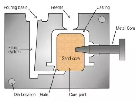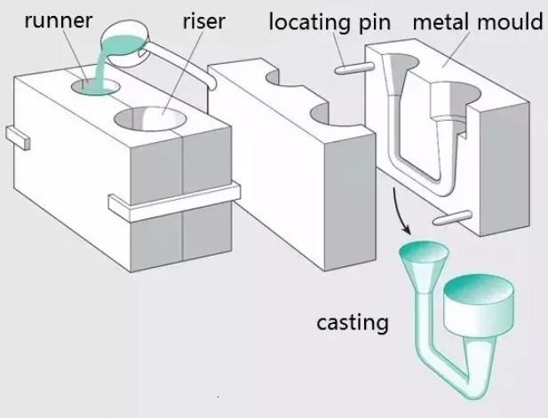 金属型铸造:指液态金属在重力作用下充填金属铸型并在型中冷却凝固而获得铸件的一种成型方法。