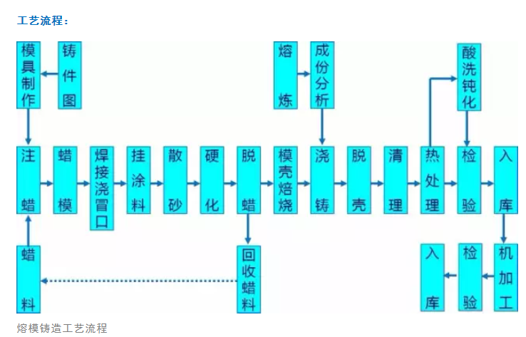 熔模铸造:通常是指在易熔材料制成模样,在模样表面包覆若干层耐火材料制成型壳,再将模样熔化排出型壳,从而获得无分型面的铸型,经高温焙烧后即可填砂浇注的铸造方案。常称为“失蜡铸造”。
