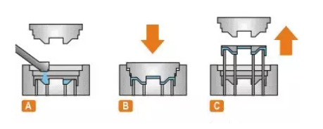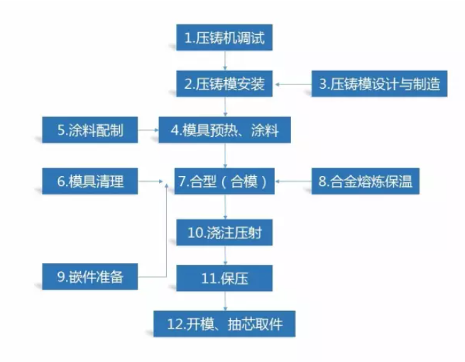 直接挤压铸造:喷涂料、浇合金、合模、加压、保压、泄压,分模、毛坯脱模、复位;