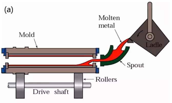 连续铸造:是一种先进的铸造方法,其原理是将熔融的金属,不断浇入一种叫做结晶器的特殊金属型中,凝固(结壳)了的铸件,连续不断地从结晶器的另一端拉出,它可获得任意长或特定的长度的铸件。
